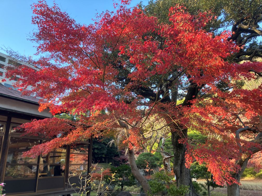 庭先の楓の紅葉の様子です。この日は、涵徳亭の中も多くの来客で賑わっていました。
