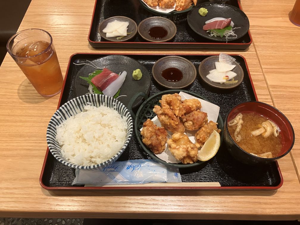 今回、水産店ではありましたが、美味しそうだったので唐揚げ定食に決めてしまいました。小鉢で、お刺身も付いてきました。